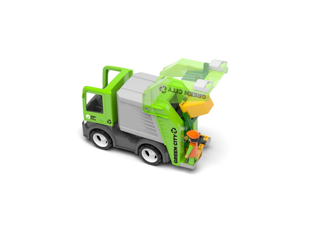 • Popelářský vůz umožňuje vyklopení popelnice, kterou popelář snadno uchopí. Má dvě sklápěcí stupačky, na které je možné umístit figurku popeláře.