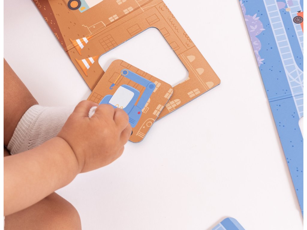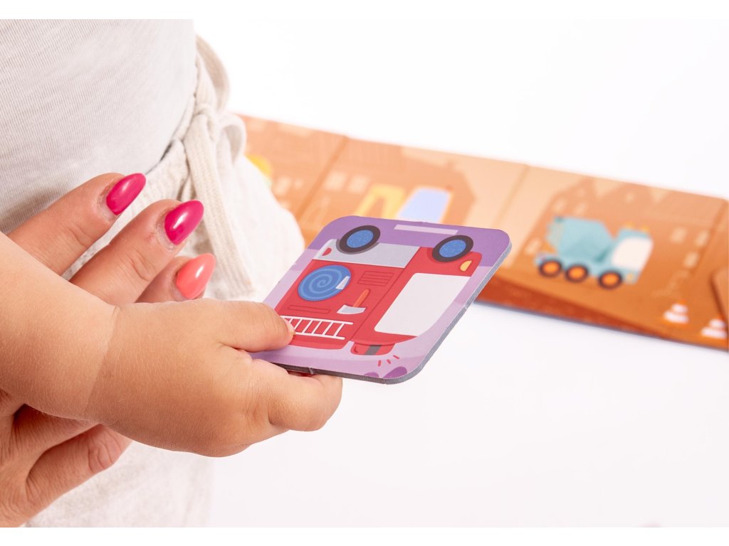 • Upevňuje znalosti o dopravních prostředcích, které děti běžně potkávají ve městě, na stavbě nebo na nádraží.