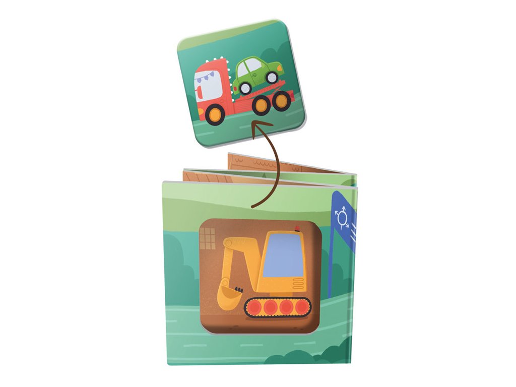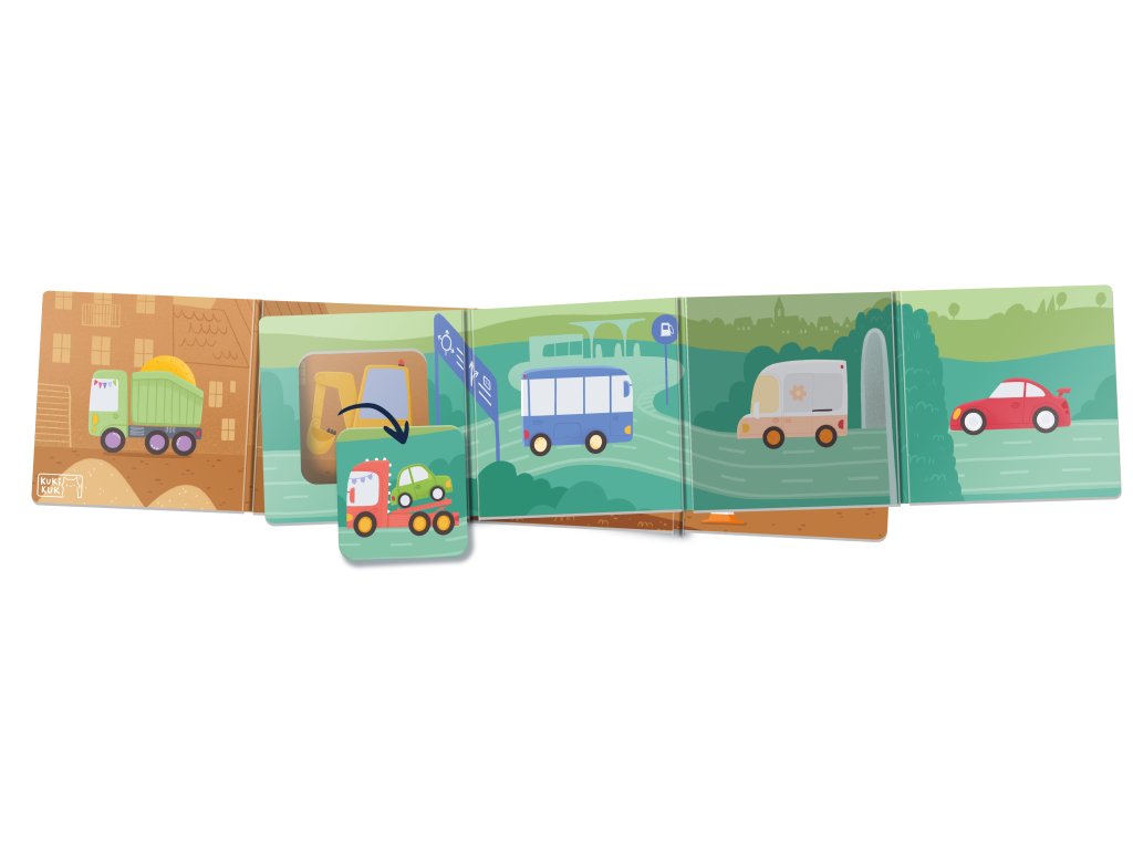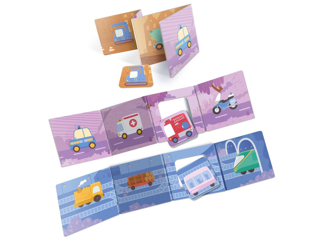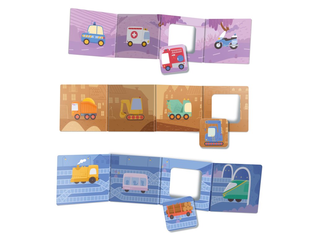 Každé leporelo obsahuje 4 vozidla a zaměřuje se na jiné prostředí – staveniště, záchranářské vozy, vlaky a další. Díky vyřezaným otvorům a vyjímatelným dílkům vznikají nové kombinace a překvapivé průhledy. Děti hledají správné vozidlo pro danou situaci, ale mohou také vymýšlet vlastní příběhy a kombinace.