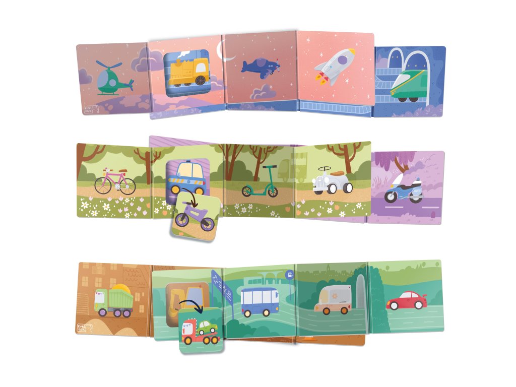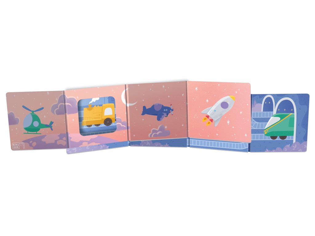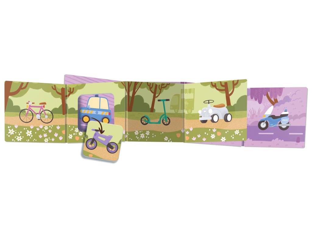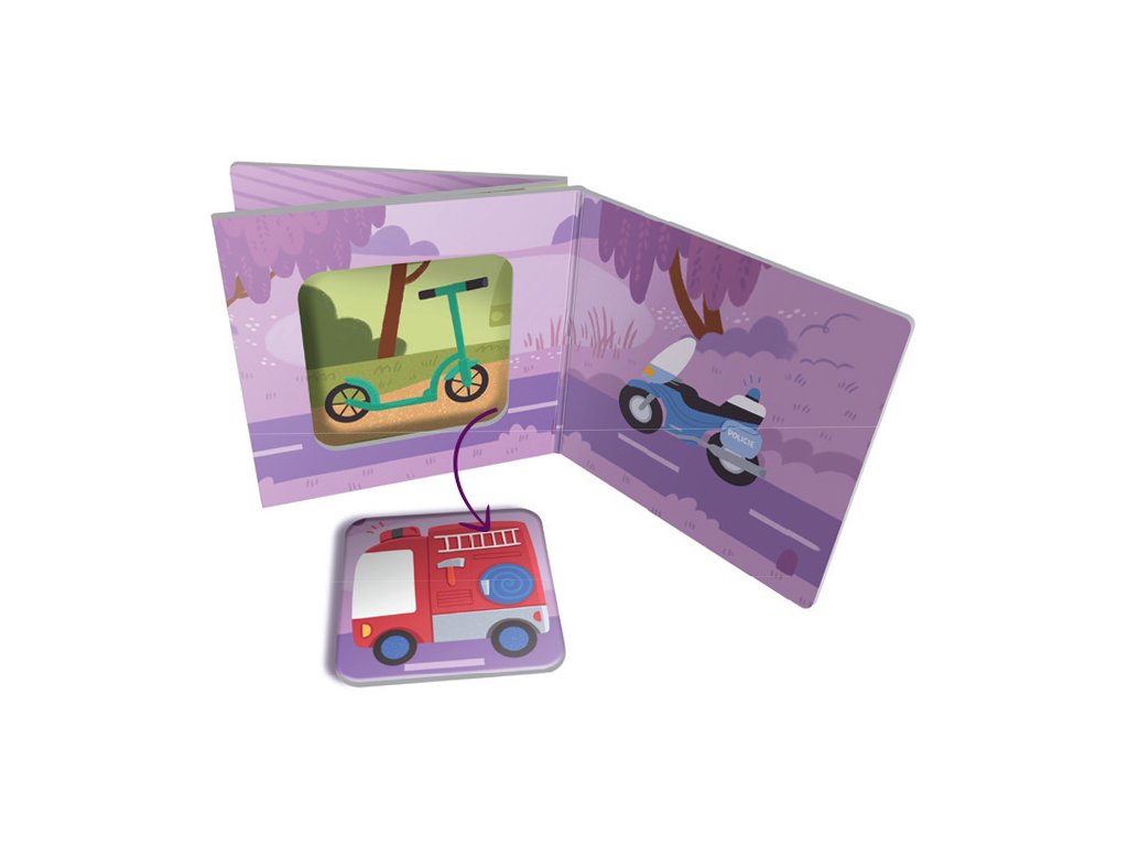 Každé leporelo obsahuje 4 vozidla a zaměřuje se na jiné prostředí – staveniště, záchranářské vozy, vlaky a další. Díky vyřezaným otvorům a vyjímatelným dílkům vznikají nové kombinace a překvapivé průhledy. Děti hledají správné vozidlo pro danou situaci, ale mohou také vymýšlet vlastní příběhy a kombinace.
