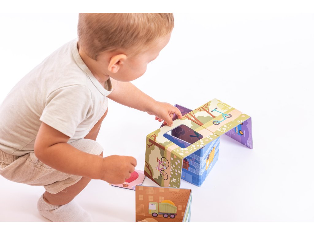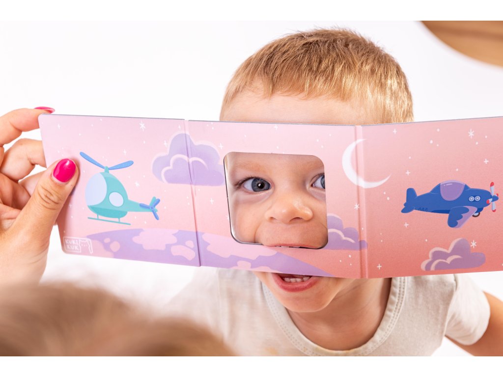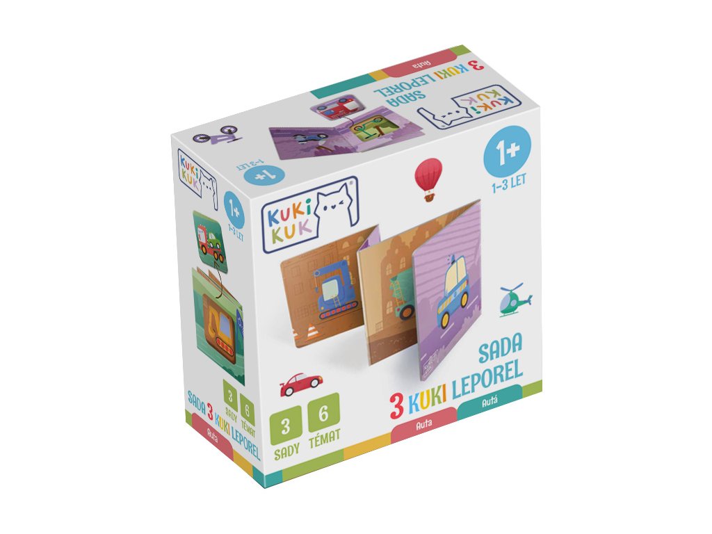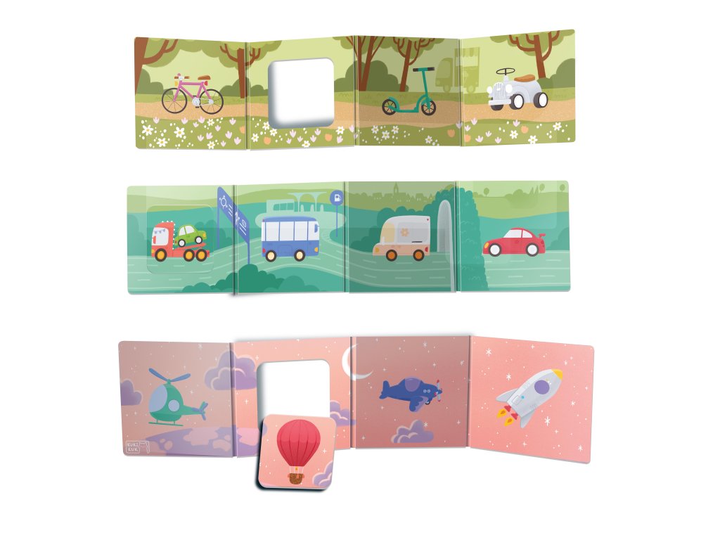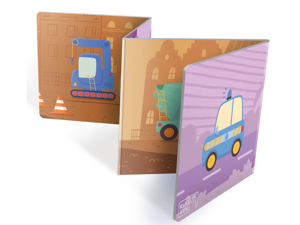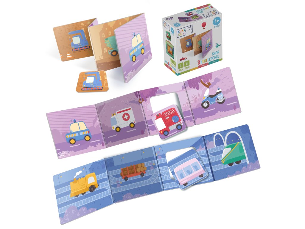 Sada 3 interaktivních leporel s šesti tématy s dopravními prostředky a otvorem pro KUK efekt. Děti objevují, co se skrývá na dalších stránkách, hrají si s výřezy a pohyblivými dílky. Díky různým kombinacím stránek vznikají nečekané průhledy a překvapení. Rozvíjejí přitom jemnou motoriku, logiku i fantazii.