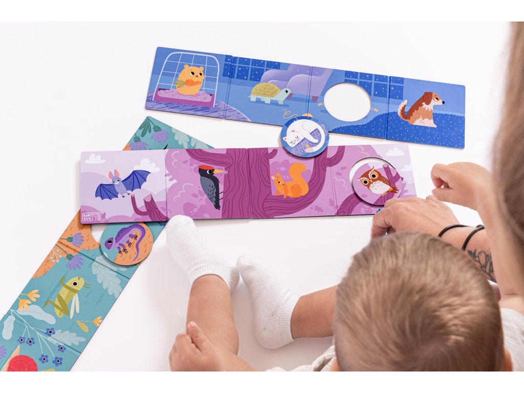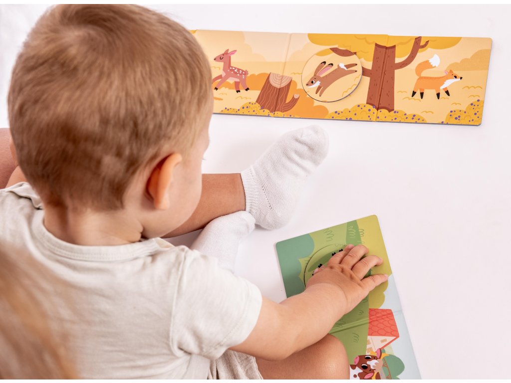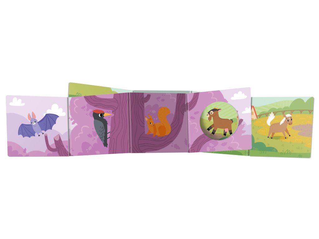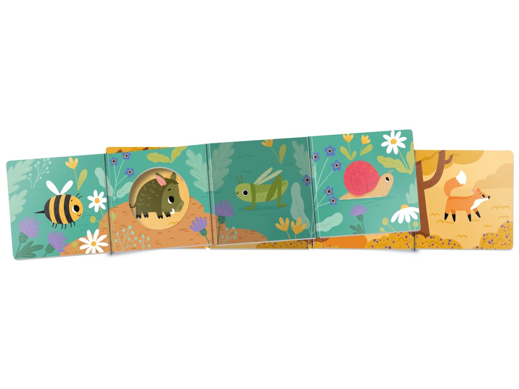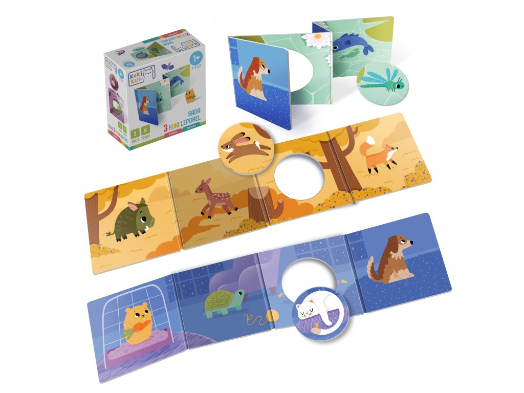 Tři krásně ilustrovaná leporela se zvířátky a vkládacími žetony, které rozvíjejí fantazii, jemnou motoriku a poznávání přírody. Děti zkoumají prostředí jako louku, rybník či les a objevují překvapivé „KUK efekty“ s každým posunutím stránky.