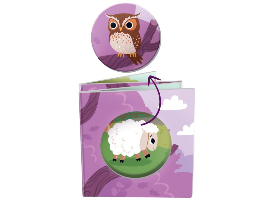 Sada obsahuje 3 leporela s 6 tématy, vždy 4 zvířátka v jejich prostředí: na louce, v lese, na rybníce atd. Každé leporelo obsahuje jeden výřez a s jeho pomocí děti objevují nové „KUK efekty“ – díky různým kombinacím stránek vznikají nečekané průhledy a překvapení. Hra se znásobuje vkládáním kulatých dílků – děti hledají správné místo pro zvířátko a zároveň rozvíjejí jemnou motoriku, logiku i fantazii. Při použití jiných kombinací vznikají zajímavé nové souvislosti, které podporují k vyprávění nových příběhů. Skvělá hračka pro malé objevitele na cesty nebo do čekáren.