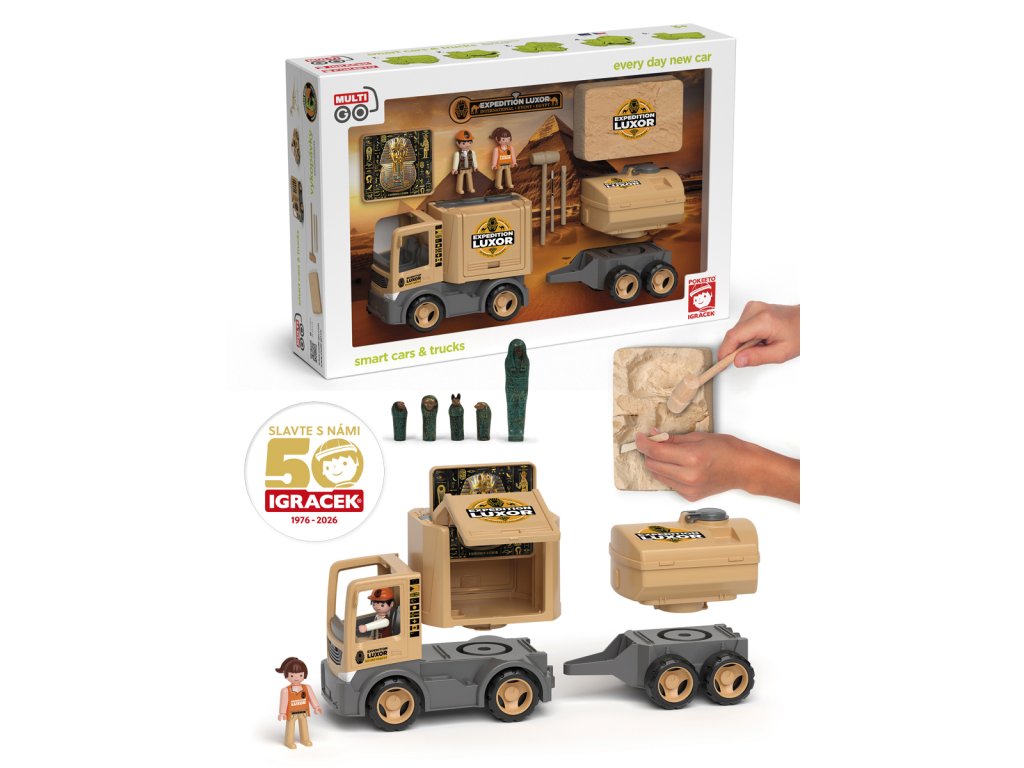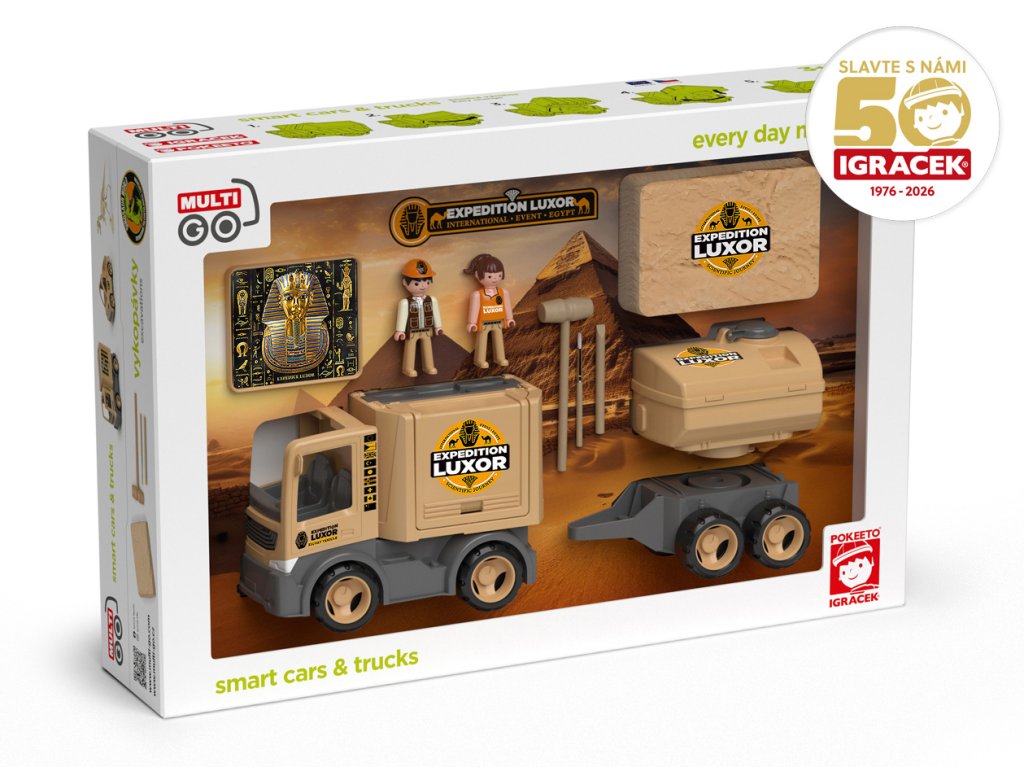 Vydejte se s Igráčky v expedičním kamionu MultiGO® na dobrodružnou výpravu do horkého Egypta! V písku čeká tajemství dávných faraónů: sarkofág a čtyři kanopy. Vyzbrojte se nářadím, opatrně odhalte nálezy a staňte se týmem malých archeologů, který si domů přiveze velký objev.