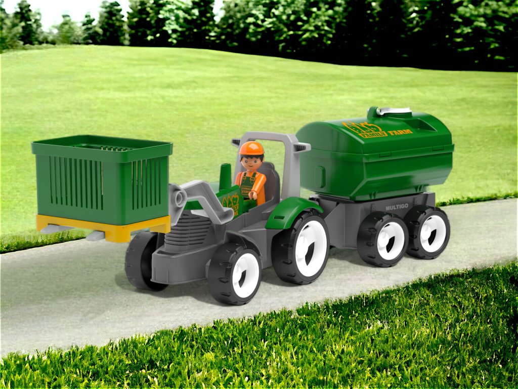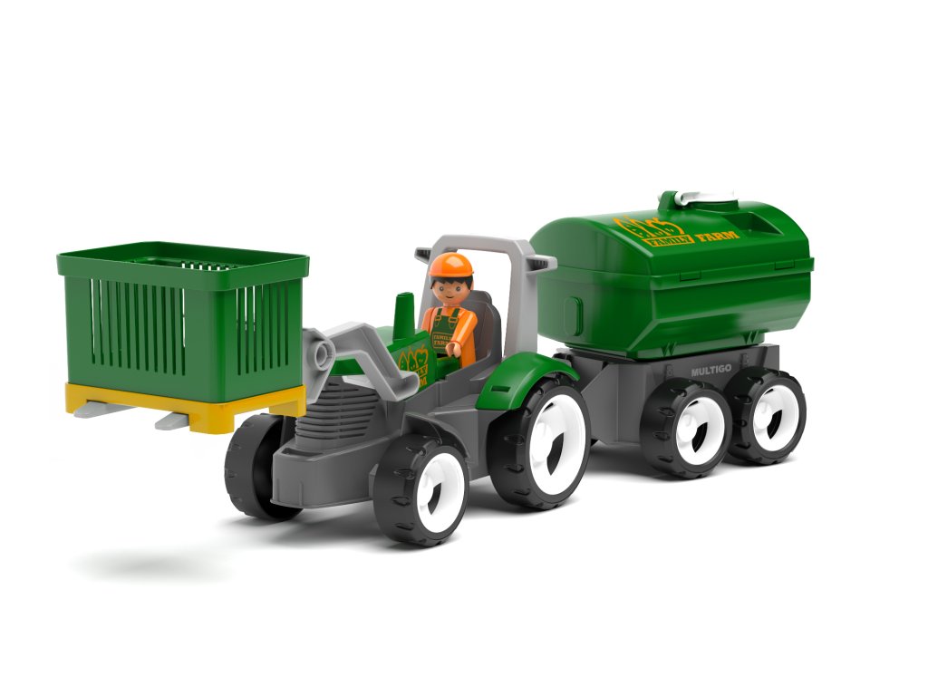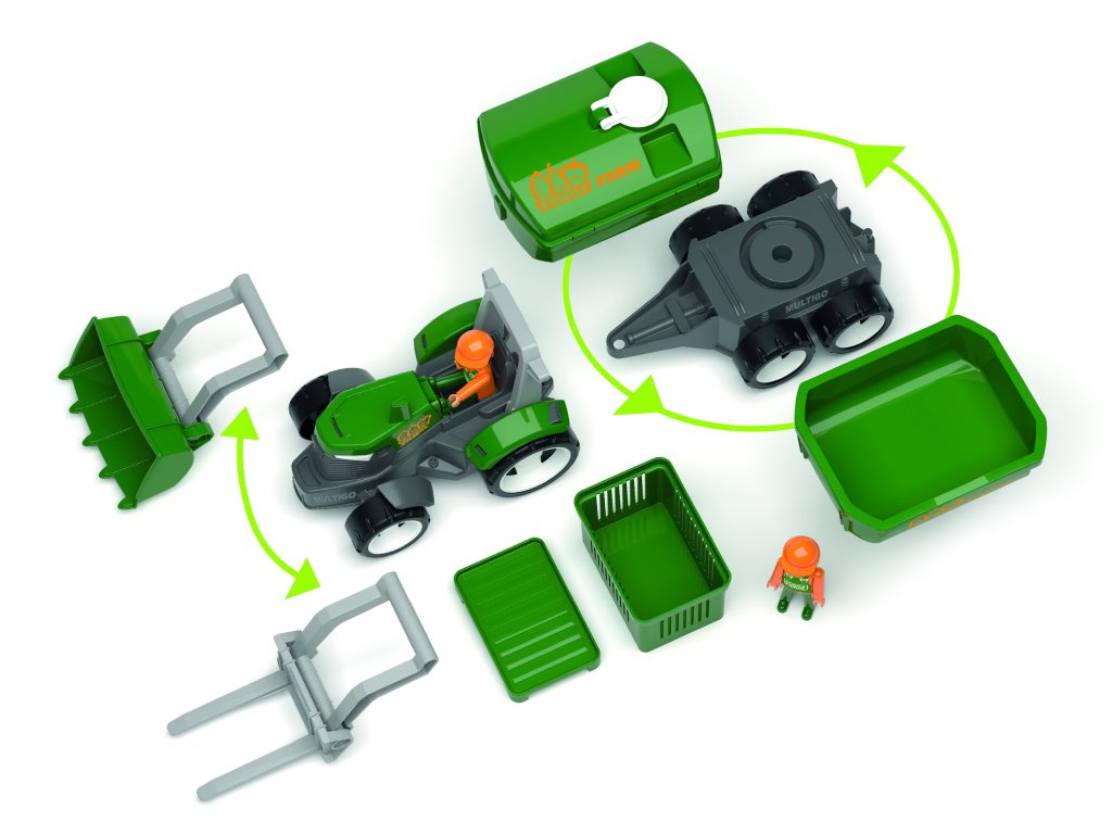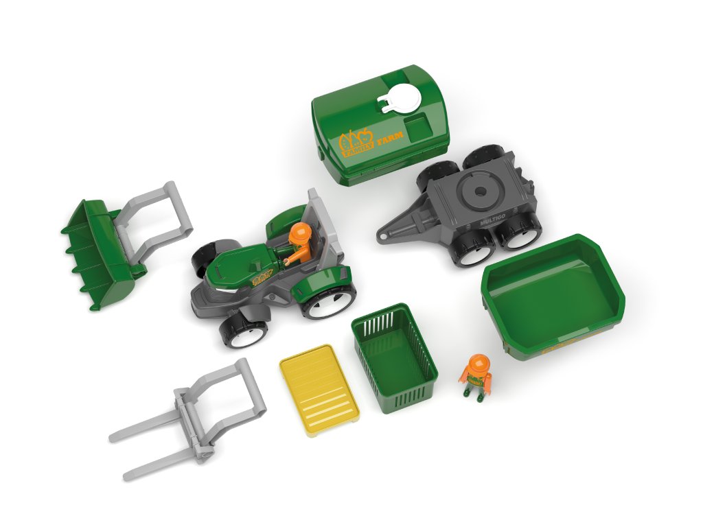 Kvalitní hrací set. Igráčci farmáři a traktor MultiGO s jedinečným stavebnicovým systémem výměny nástaveb a příslušenství pro děti od 3 let je ideální hračkou pro rozvoj jemné motoriky a fantazie.