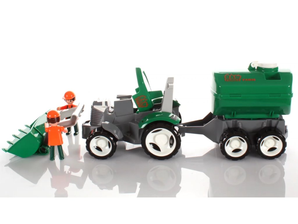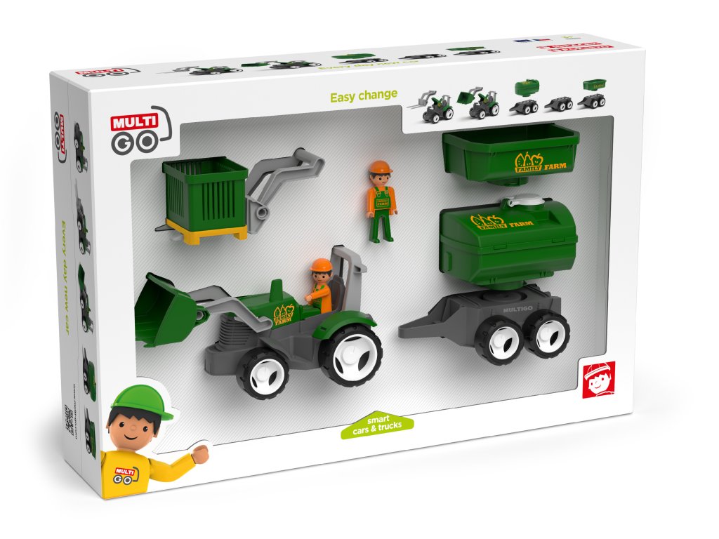 • MultiGO Farm set obsahuje: traktor, vyměnitelnou radlici a nakládací vidle, paletu, paletový koš, přívěs a dvě vyměnitelné nástavby – cisteru a valníček a dva Igráčky.