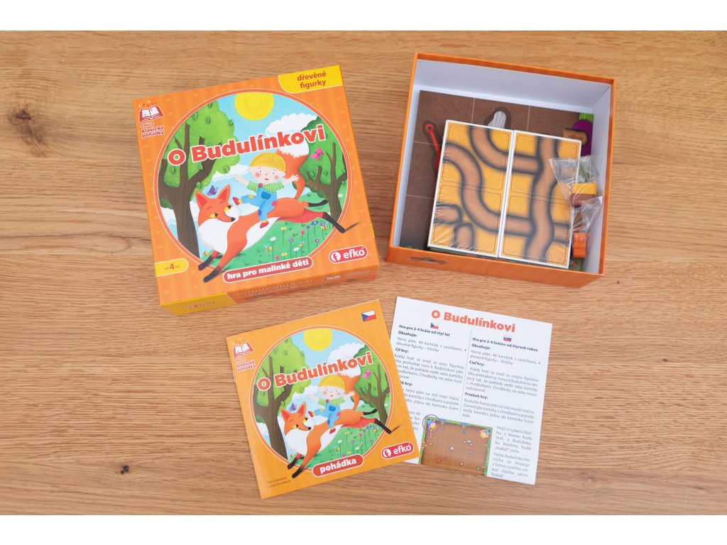 Ponořte se spolu s děti do oblíbené pohádky O Budulínkovi. Stanete se jednou z lištiček, která se snaží jako první dostat k Budulínkovi. Za pomoci kartiček k němu musíte „vyhrabat“ noru. Ale pozor, kartičky na sebe musí navazovat. Hra je vhodná pro děti od 4 let a pro 2-4 hráče.